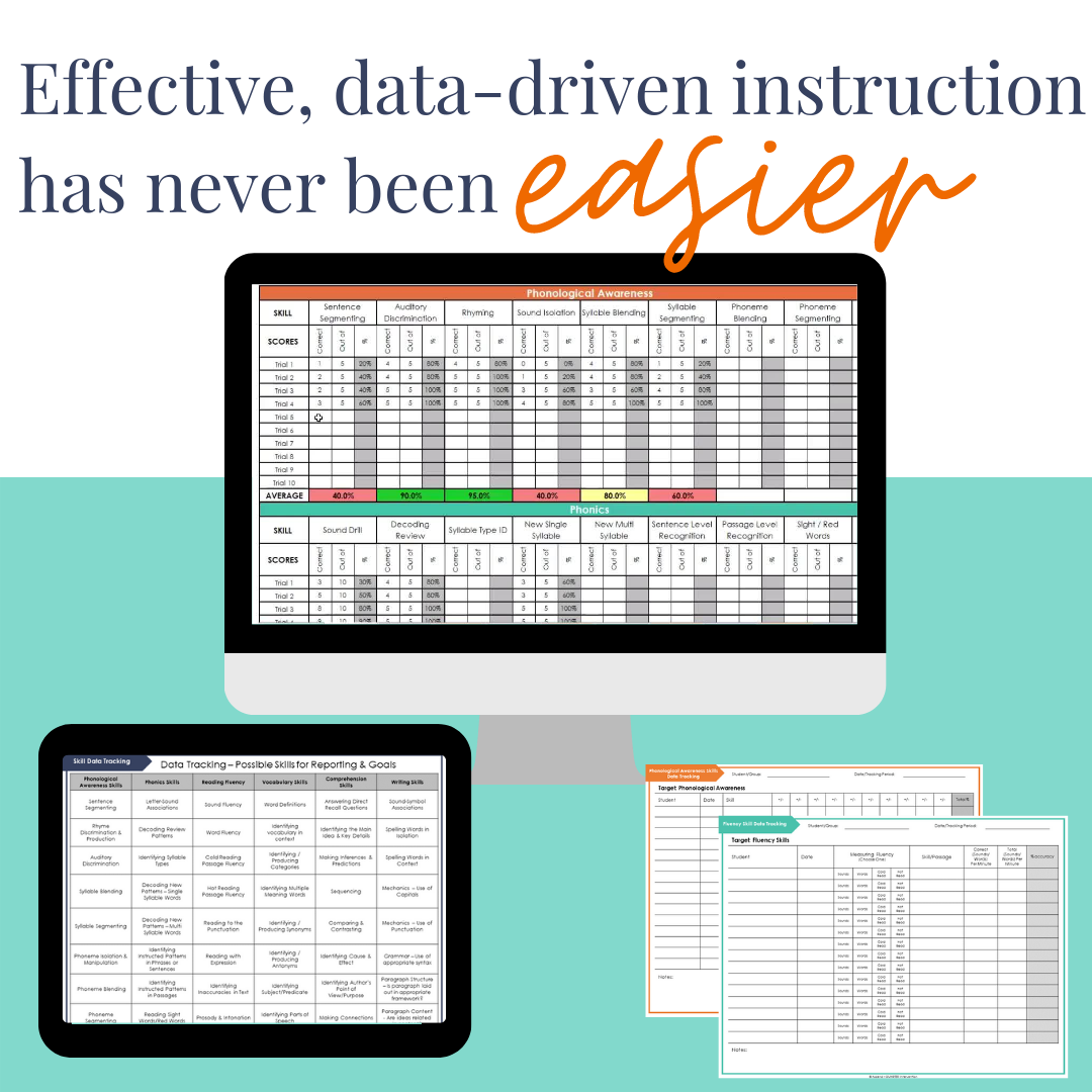 So all this to say, if we set goals to help support these underlying skills very specifically we can improve the cause of the reading struggle and not just address the symptoms. To begin easily using data tracking in your instruction, be sure to grab our free Data Tracking System. This tool will help make data tracking easy and help you keep your session data organized.