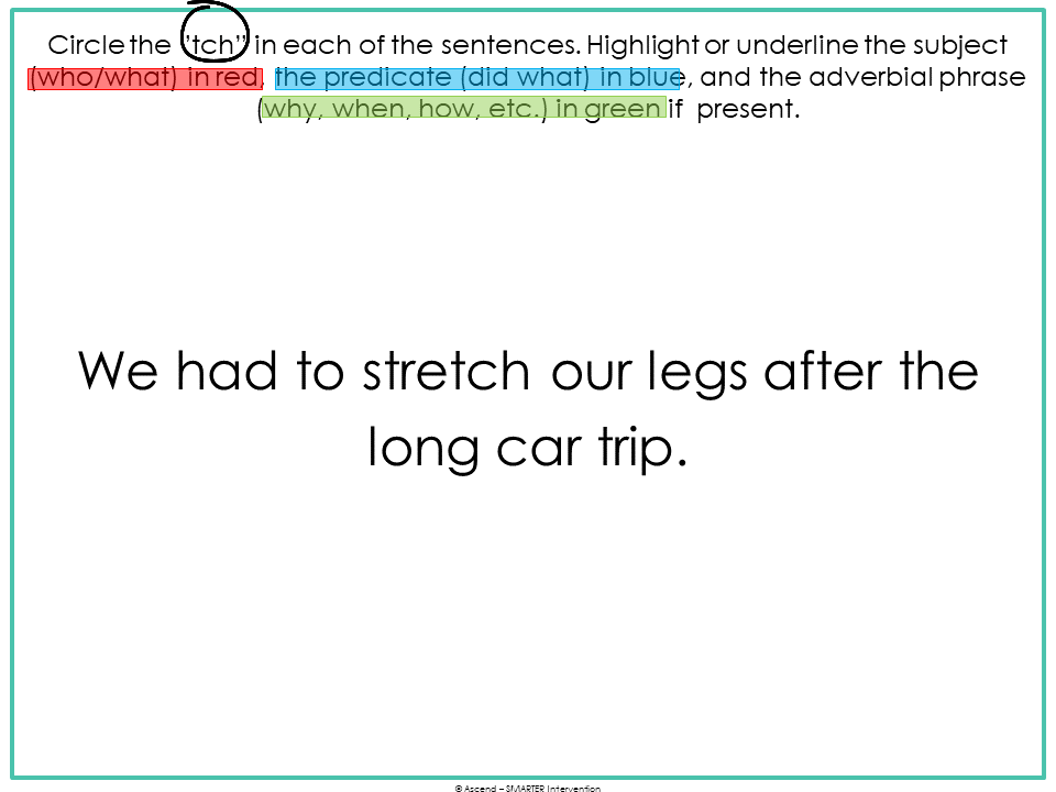 It’s also an opportunity to begin working on sentence syntax, fluency, and comprehension by asking them to identify who/what (the subject), is/does/did what (the predicate), when/where/why/how (the adverbial clause - if present).