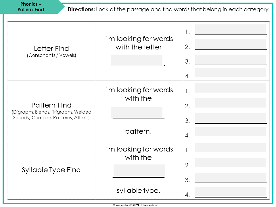 We can start by just asking students to find one of these three options (letters, patterns, or syllable types) and then as they are ready, they can progress to finding more patterns.