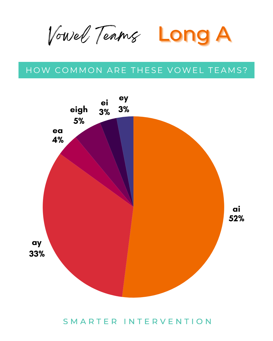 In vowel team syllables, we can use AI or AY (and a few other options as you can see in the pie chart!)