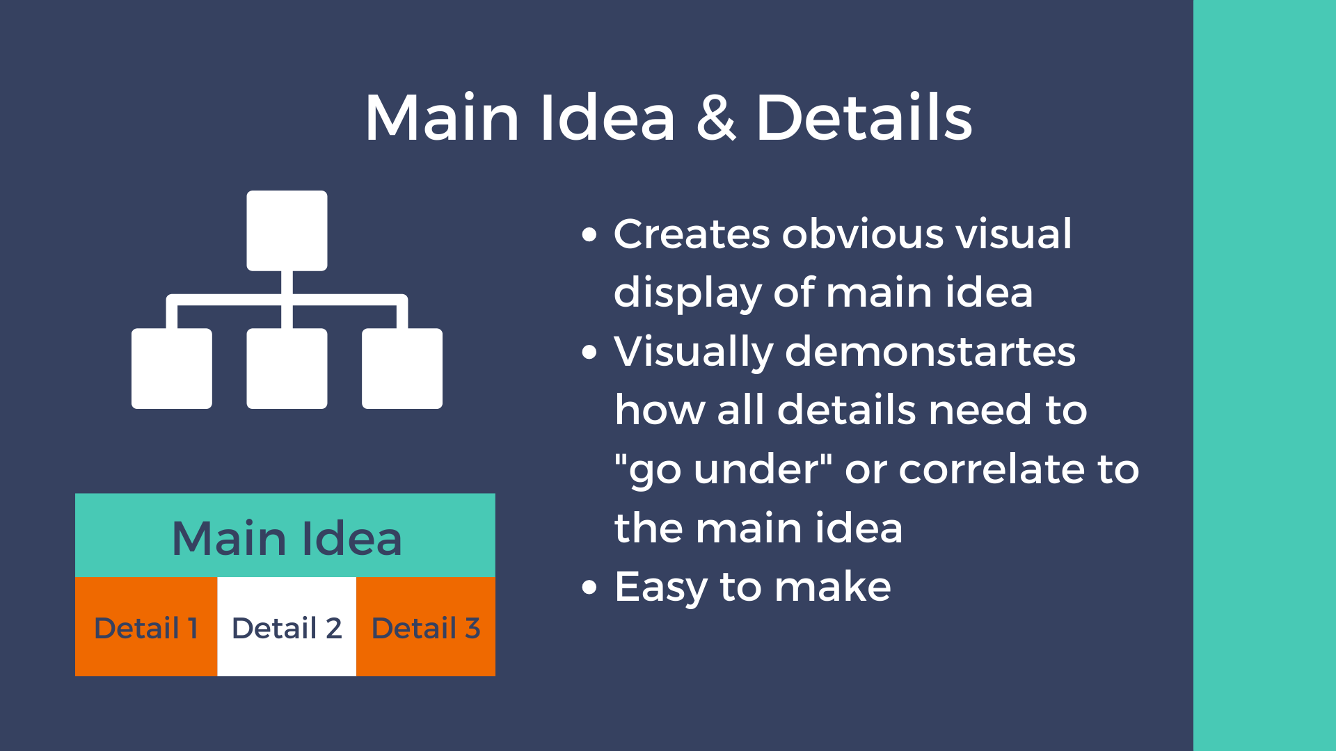 This organizer is so simple yet so effective in showing how all details must fit under and be related to the main idea. In our lessons, we specifically teach students to focus on identifying the main idea and key details. We explain that key details should fit under the main idea umbrella.
