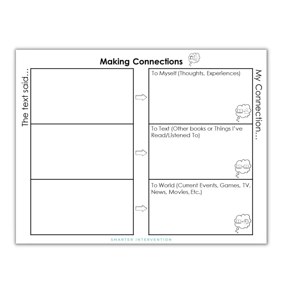 A few of the key types of connections we teach include text-to-self, text-to-text, text-to-world, compare and contrast, and cause and effect.
