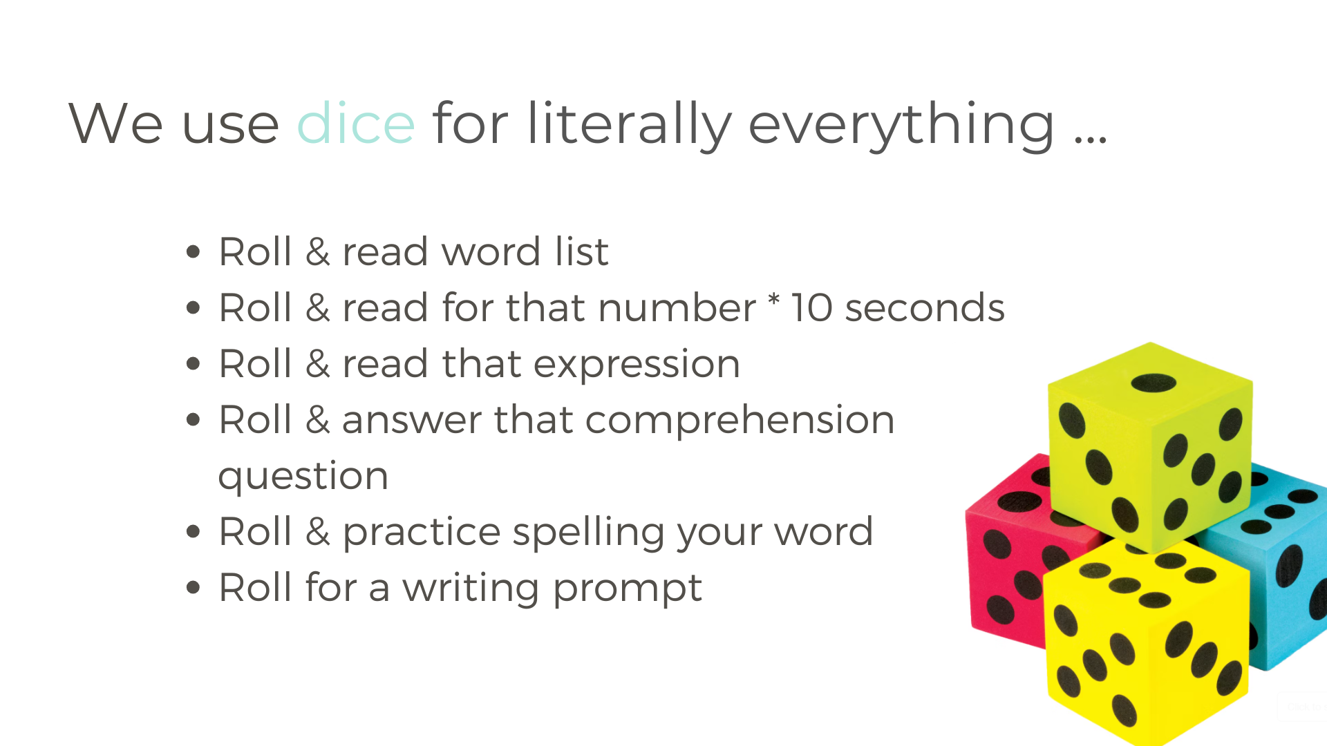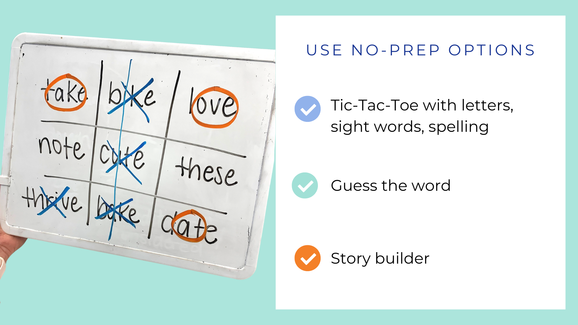 Low lift for educators. You can grab what you already have (a word list, a whiteboard, a dice) and go.