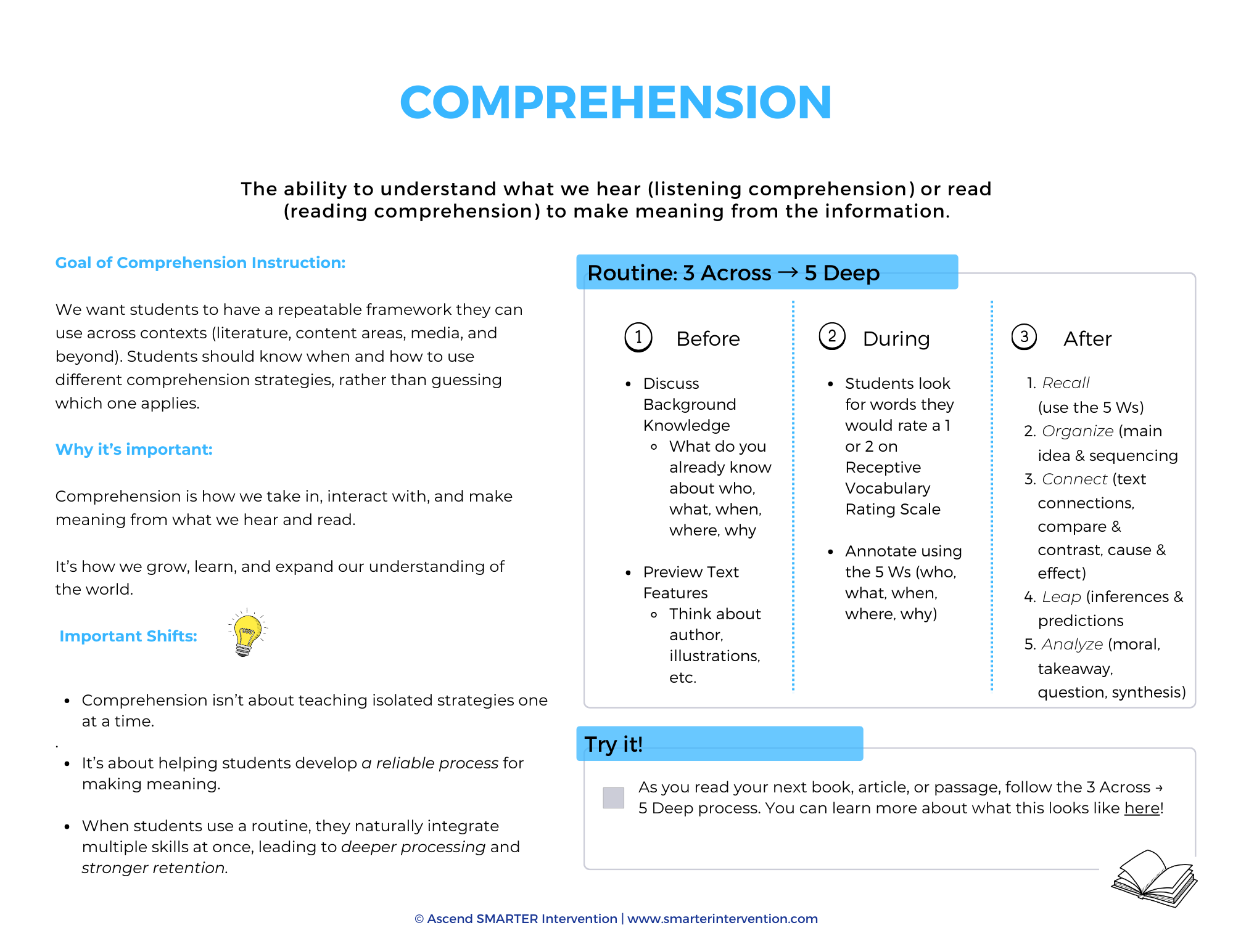 To help put this information into practice, we’ve made a FREE comprehension routine that you can use with any book, article, or passage. This routine will help students understand what they’re reading or hearing by using a repeatable framework that they can use across contexts. Try it now!