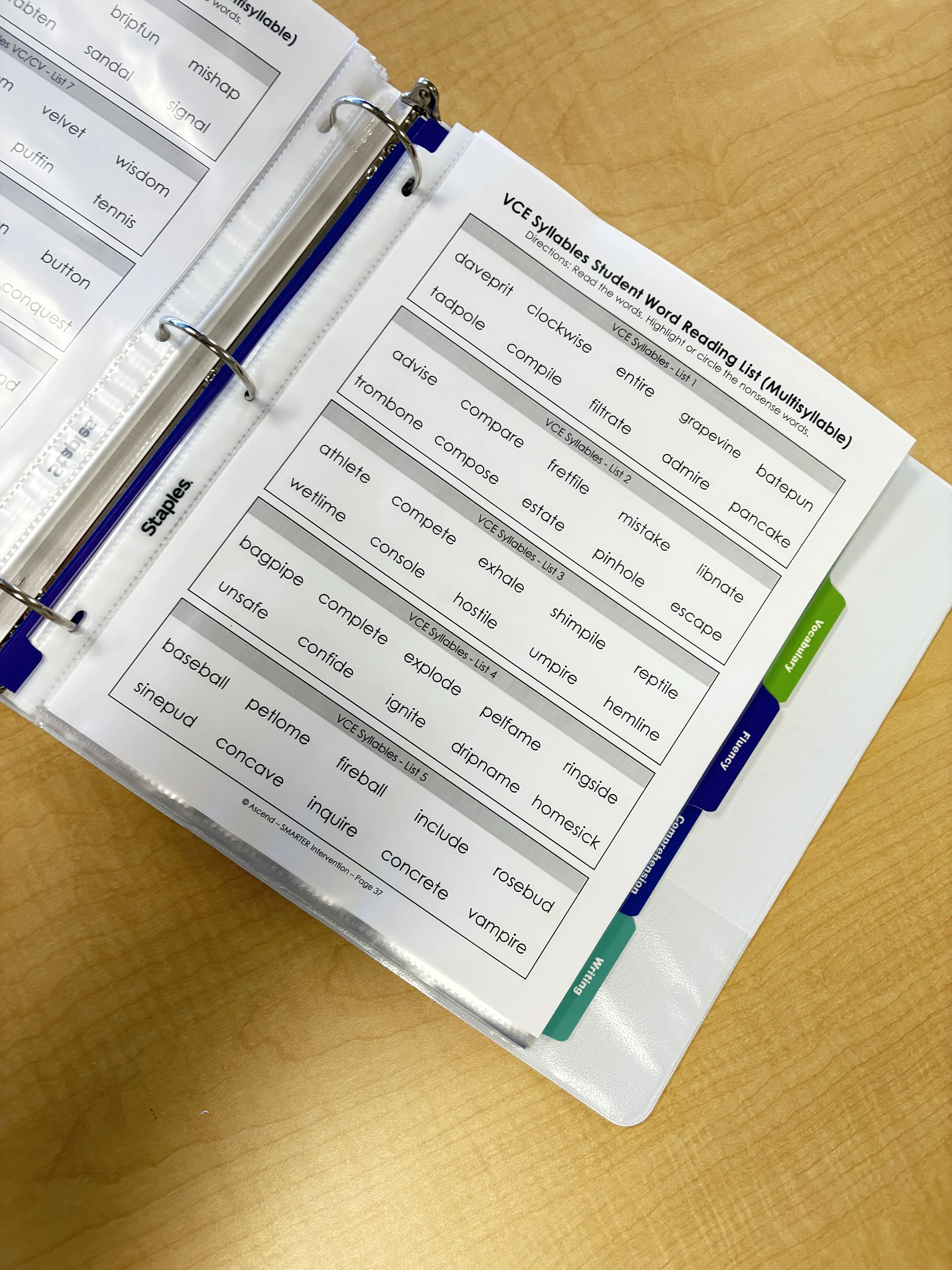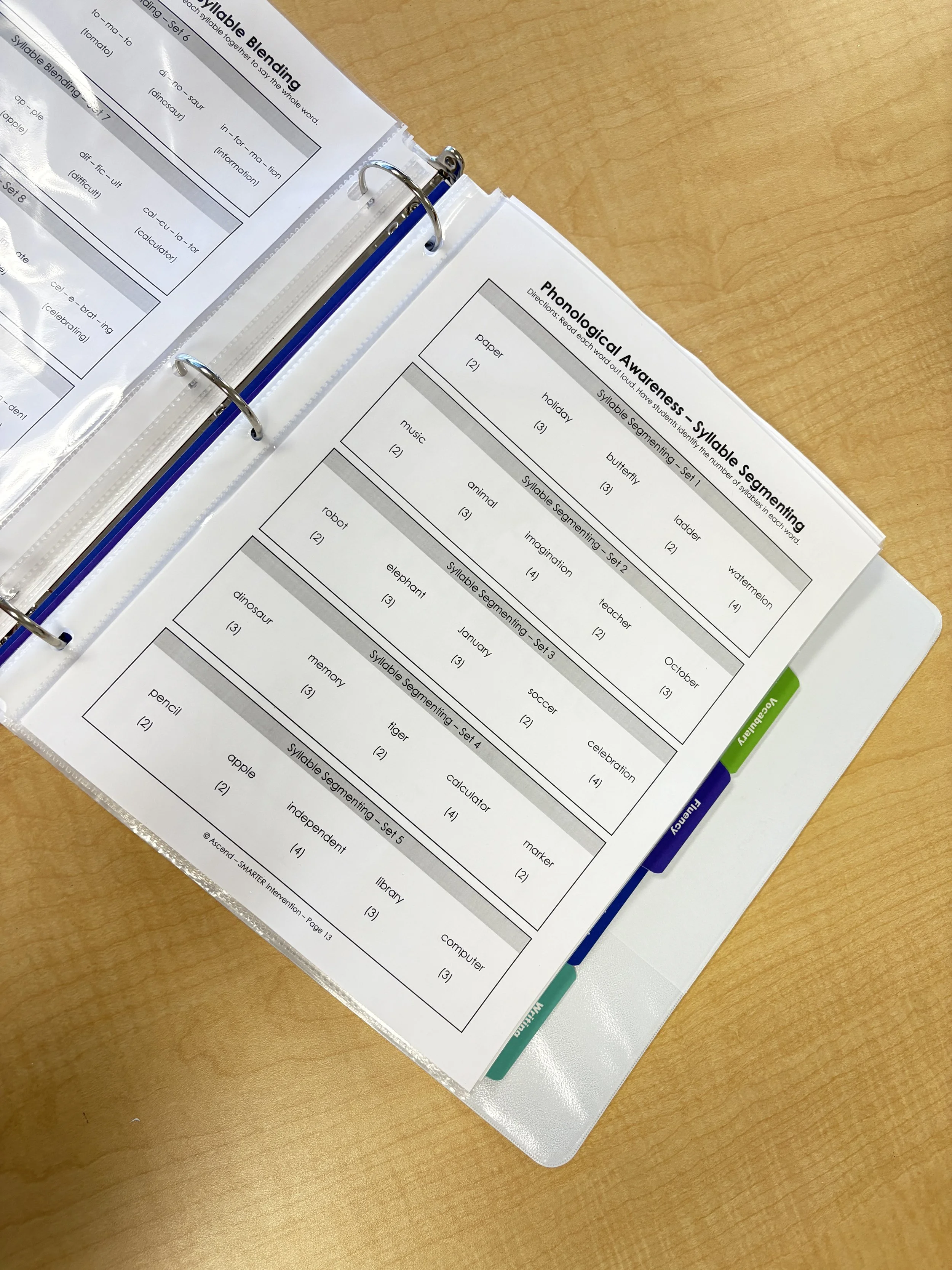 How to Track: During a lesson, we may provide a student with five words and ask them to tell us how many syllables they hear in each word. Tally correct/incorrect responses for a set number of opportunities (e.g., 4/5 = 80%).
