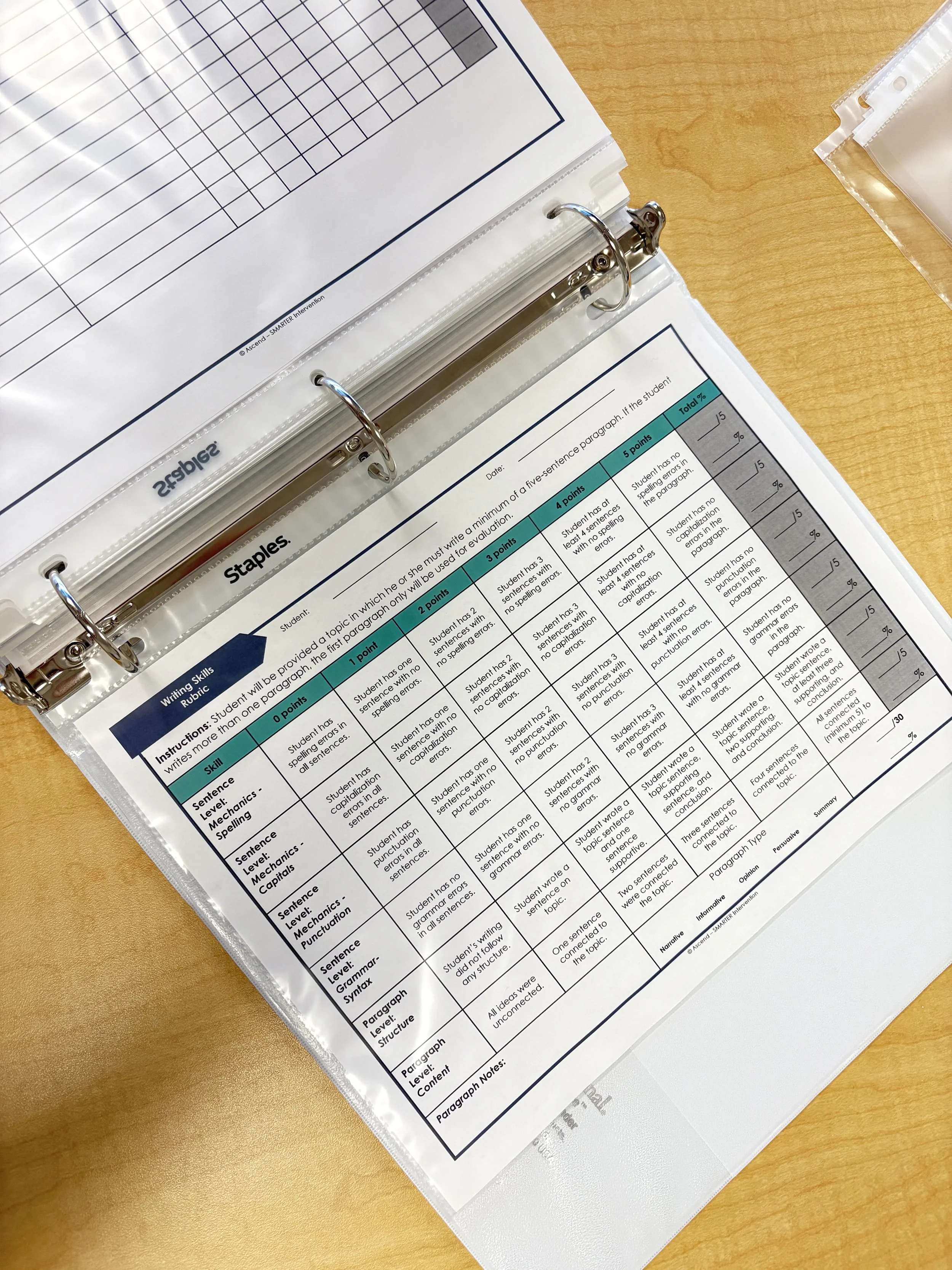 How to Track: We have students respond to writing prompts during their lessons and grade them, or have them grade themselves on their writing using a rubric.
