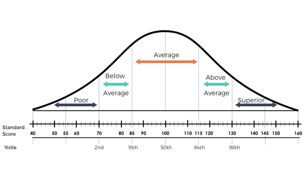 You can typically tell that you have a standardized assessment because scores are provided as Standard Scores (Average of 100) with Percentile Ranks (Average of 50) and could be graphed on a bell curve like this. Students’ scores should be moving toward the right as you continue intervention.