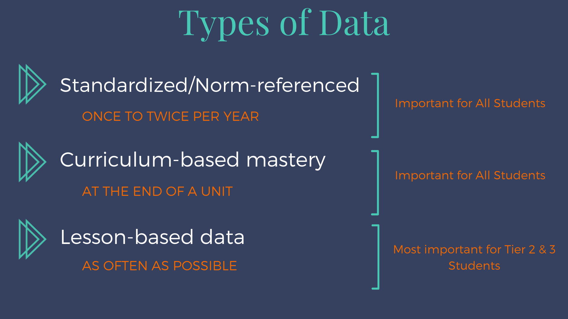 We assess (collect data) in three ways. For students that we work with we use a combination of standardized/norm-referenced data that we collect once to twice per year. We also use curriculum-based assessments to monitor mastery of the material we’ve explicitly taught. Finally, we use lesson-based data to get an idea of how students are performing over time. Now, obviously depending on your setting you may not be able to collect all of this information quite as frequently. This is totally fine, but it is important that you have a data collection plan.