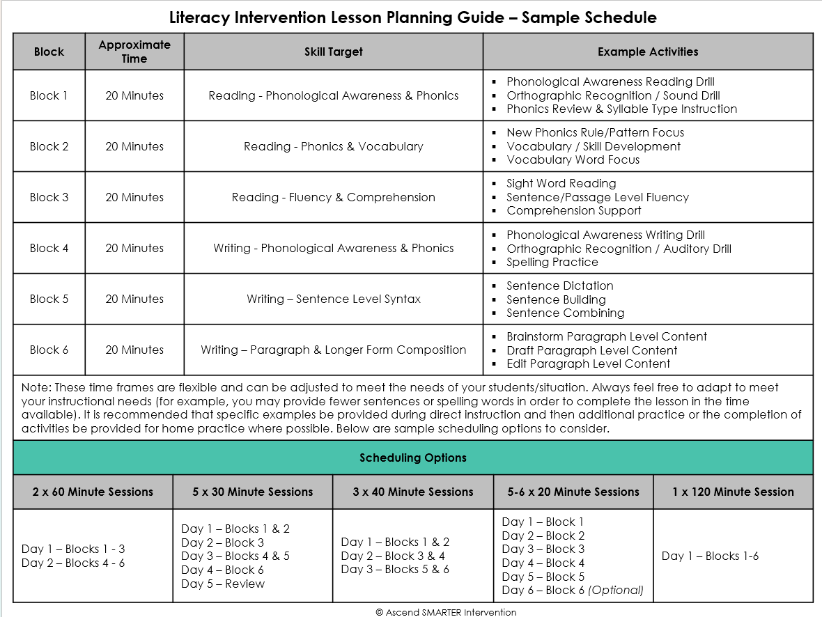 We recommend using a framework that touches on each of the five core components of reading plus writing, and building those into every session with small, purposeful routines.