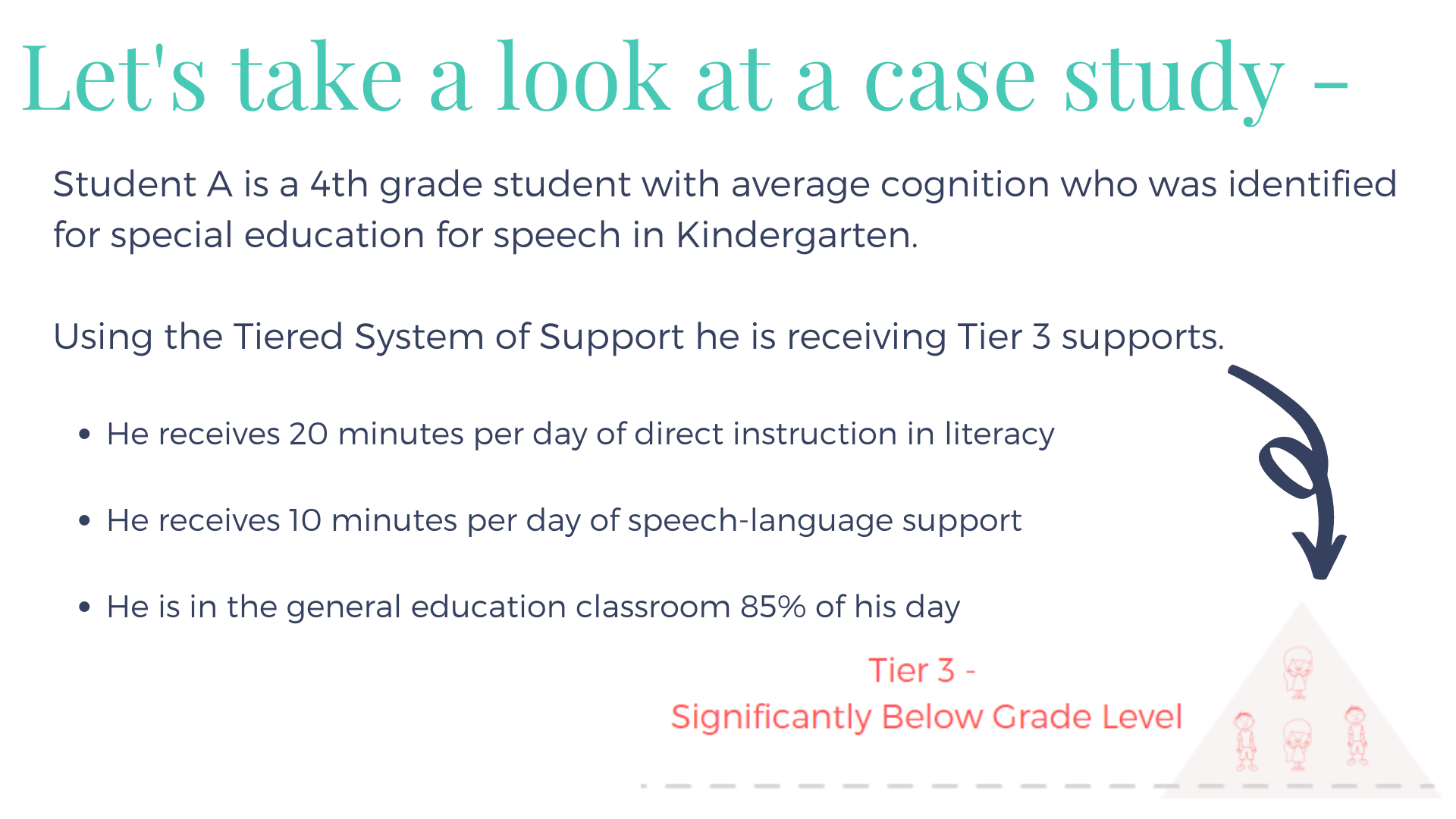 Student A is a 4th-grade student with average cognition who was identified for special education for speech in Kindergarten.