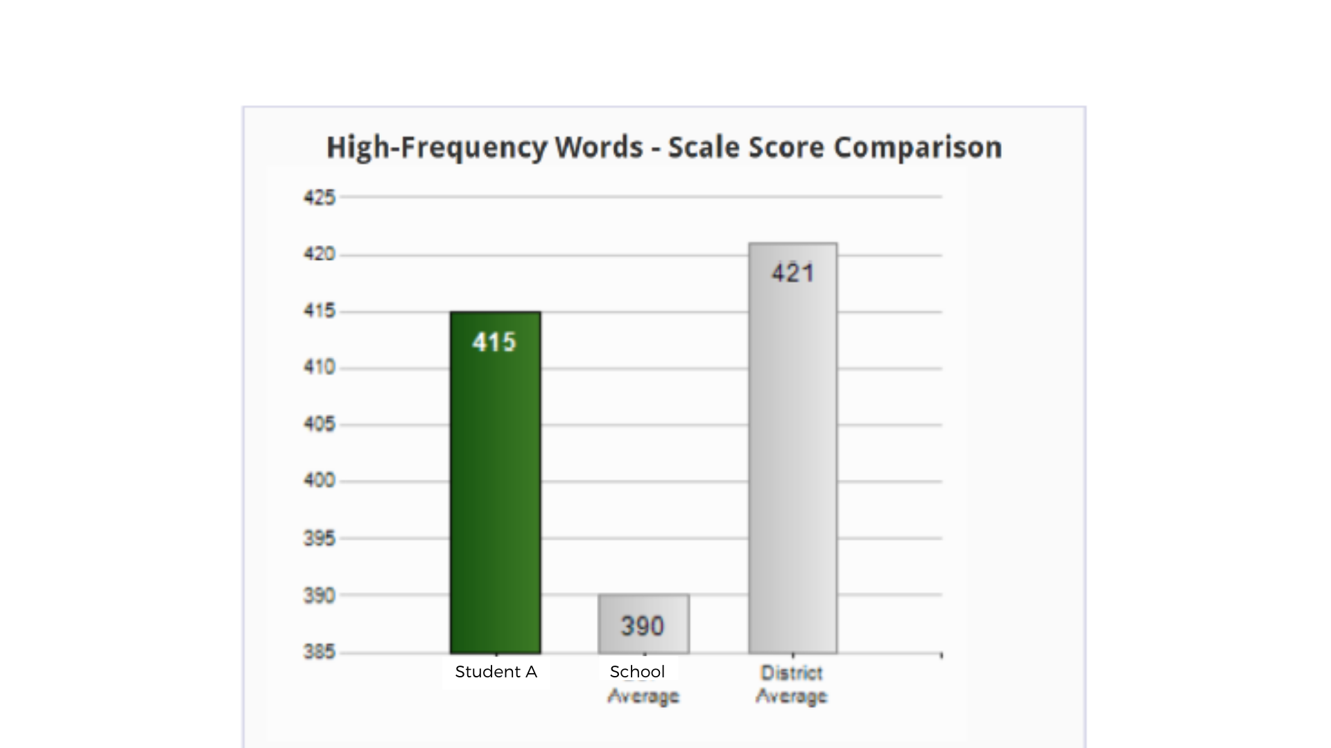 Received a Scale Score of 415 for High-Frequency words, placing him at a first-grade level, but his performance was actually better than his school’s average and consistent with the district average.