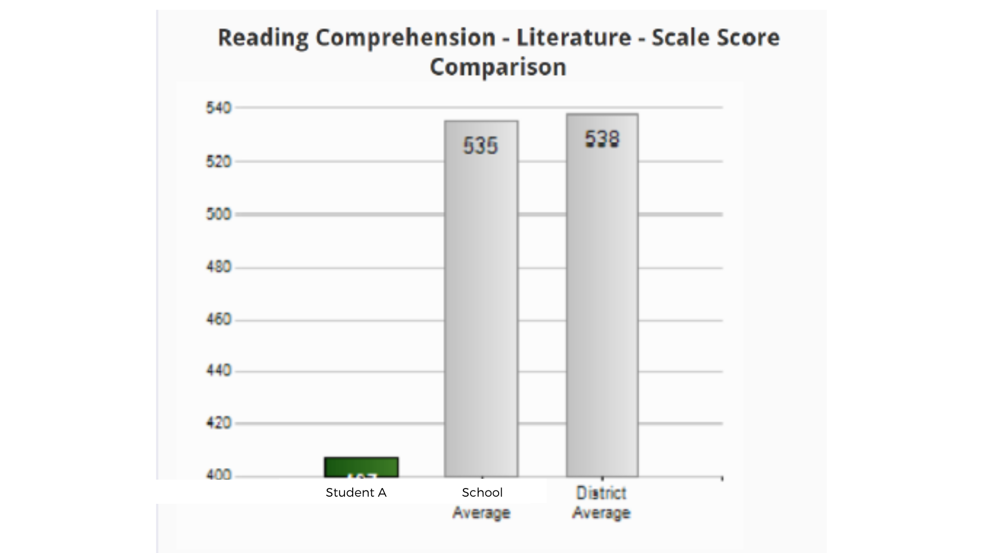 Received a score of 407, placing him at a Kindergarten level for Literature Comprehension, and a 419 placing him at a first-grade level for Informative Text Comprehension.